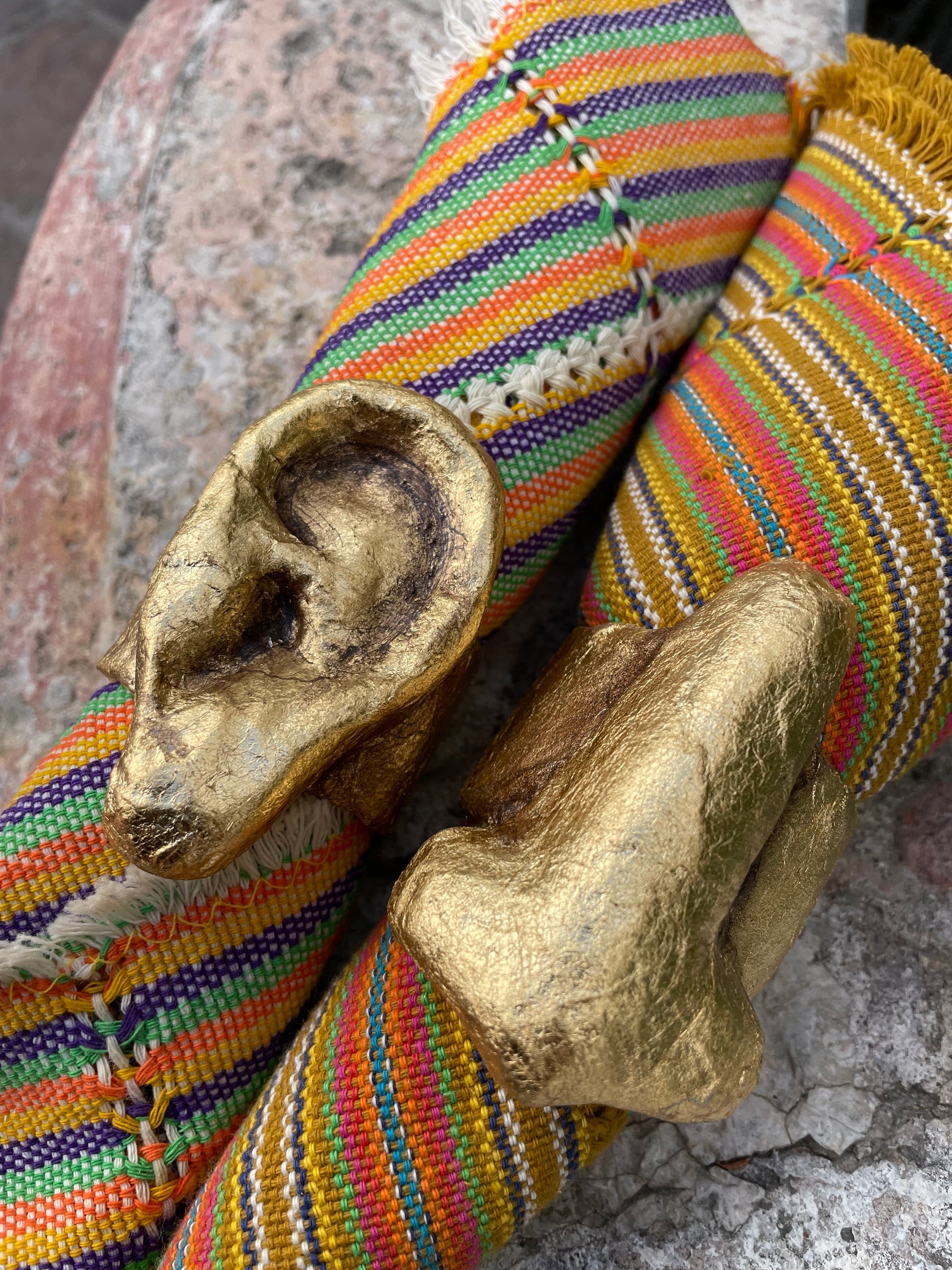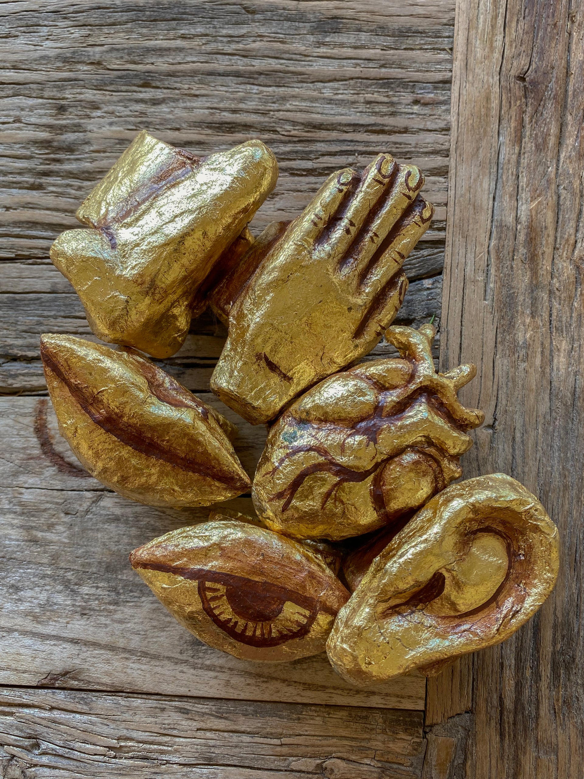 Our unique set of 6 Napkin Rings, exquisitely handcrafted from papier-mâché by the renowned artist Marco Debrayes. Each napkin ring in this set is a work of art, meticulously created to add a touch of whimsy and elegance to your dining experience.This set includes six distinct designs: Ear, Mouth, Eye, Hand, Nose, and Heart.