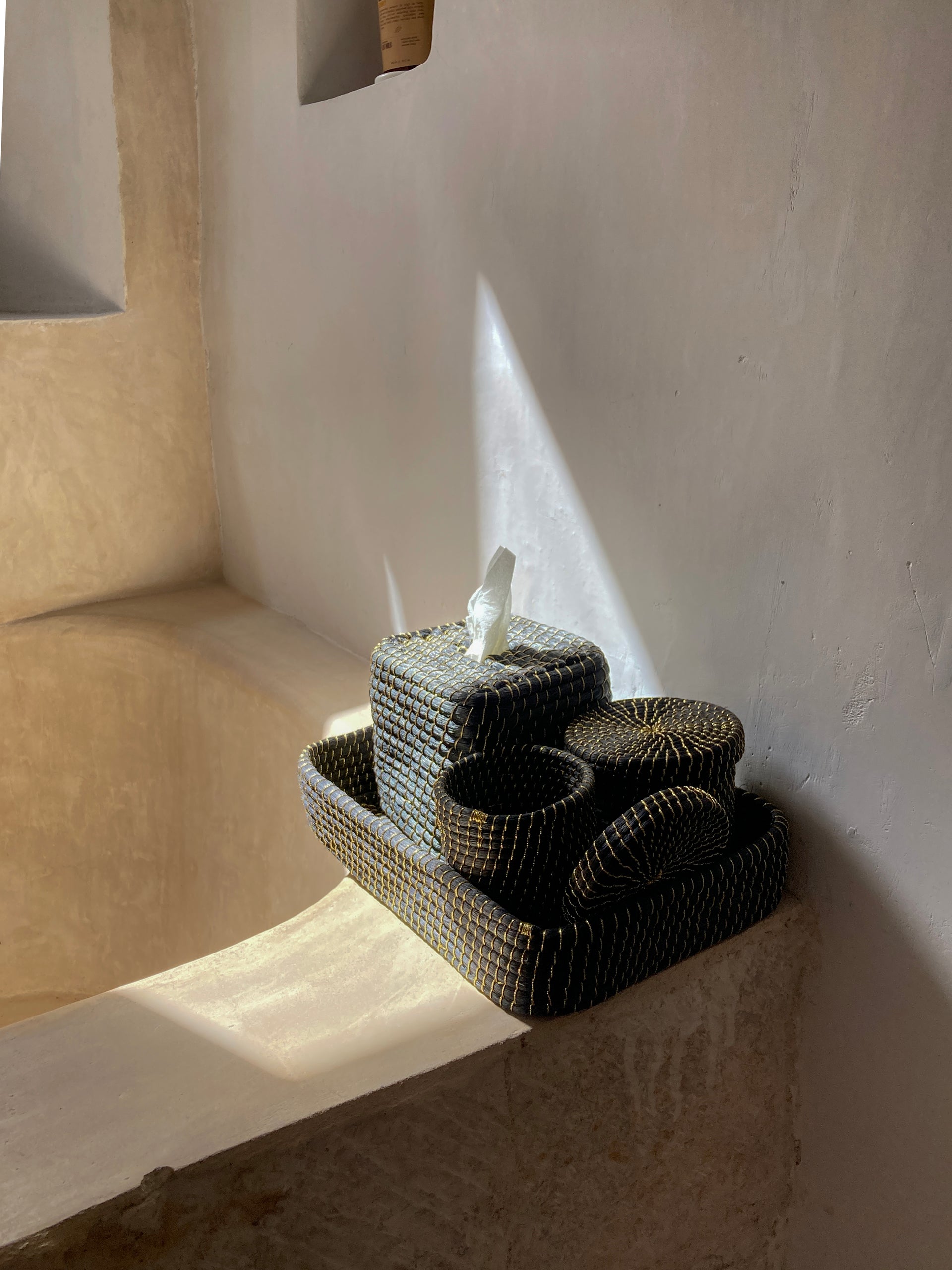 Henequen Bathroom Set, a perfect fusion of style and functionality for your bathroom décor. Each piece in this set is meticulously handcrafted by skilled artisans using natural henequen fibers, showcasing the rich cultural heritage and craftsmanship of Yucatán. Elevate your bathroom experience with this set, which includes a tissue box cover, 2 containers and a tray.